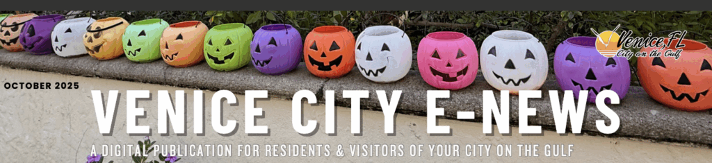 Please enjoy the October edition of the Venice City E-News by clicking on this image or the link below. Navigate the City’s e-newsletter by using the left and right arrows on your keyboard, or flip to the next page by using the arrows on the viewing screen. Explore additional resources and information by clicking on hyperlinks. Click here for the website location October 2025 Newsletter.