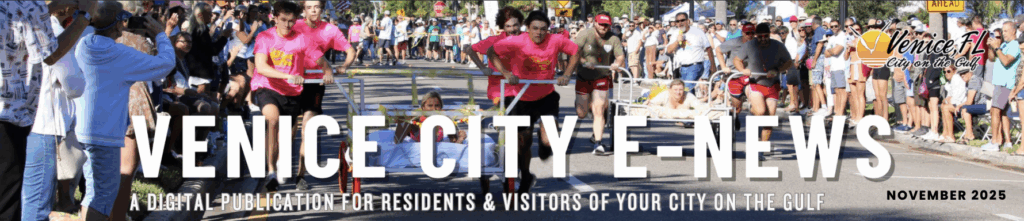 Please enjoy the November edition of the Venice City E-News by clicking on this image or the link below. Navigate the City’s e-newsletter by using the left and right arrows on your keyboard, or flip to the next page by using the arrows on the viewing screen. Explore additional resources and information by clicking on hyperlinks. Click here for the website location November 2025 Newsletter.