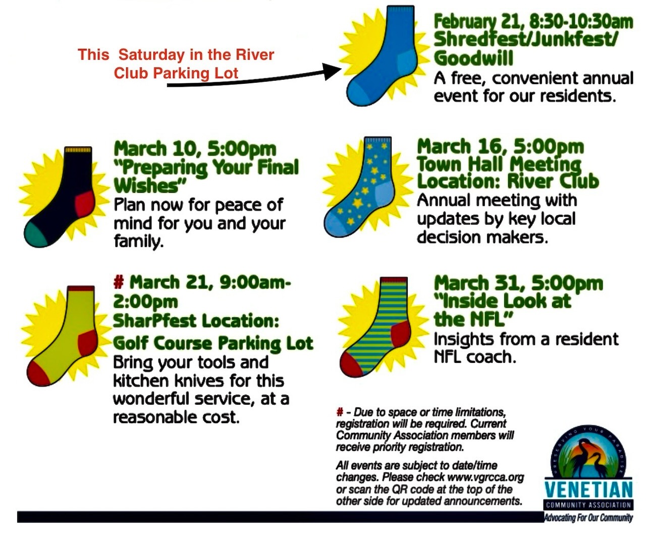Shredfest/Junkfest/Goodwill is one of the most popular events in our community. It is sponsored by the VGRC Community Association and takes place this Saturday, February 21, 8:30 am -10:30 am in the River Club Parking lot. It is open to all residents and free.