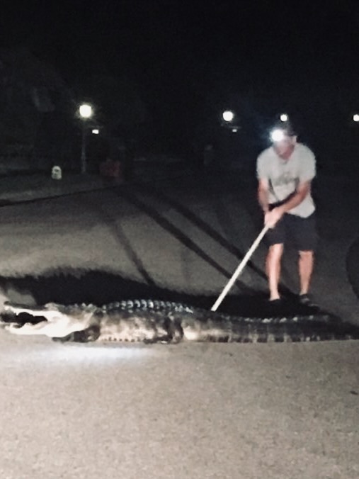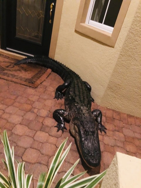 When we recently posted a photo of a gator caught on Montelluna on our website’s FRONT page, we received pictures and videos of previous visits by our local amphibian friends. About five years ago, at 1 a.m., an alligator decided to enter 241 Montelluna. The resident, Dr. Mike Dukes, was startled by a bump and hissing sound at the front door as the gator was crawling up the front door. Fortunately, Mike turned on the light and looked out before opening it. It was a 9-foot-4″ gator (as measured by the trapper) trying to get into the house! You can see the scratch on the front door in one of the photos. It took 2 policemen and the trapper to get the gator into the truck. Mike also sent some videos of a gator visiting 233 Montelluna which we’ll be posting soon on our YouTube channel. there must be something about Montelluna that attracts gators. Enjoy… well, maybe ‘enjoy’ isn’t the right word.